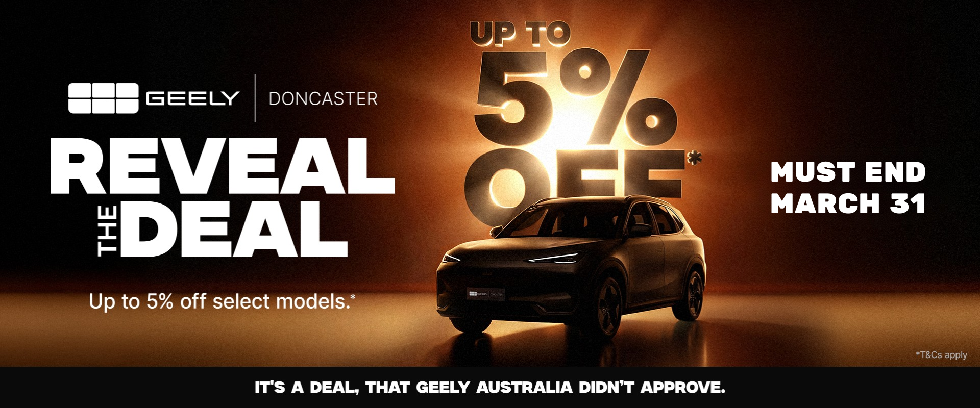 *Terms and Conditions apply. Offer available on selected in-stock vehicles at Geely Doncaster only. Discount calculated from the manufacturer’s recommended retail price (RRP). Maximum discount of $2,000 applies. Excludes government charges. Offer valid for 72 hours unless extended or withdrawn earlier. Vehicle must be purchased between 1 March 2026 and 31 March 2026 and delivered by 31 March 2026. Not in conjunction with any other offer. Geely Doncaster reserves the right to modify, extend or cancel the offer at any time. LMCT444.